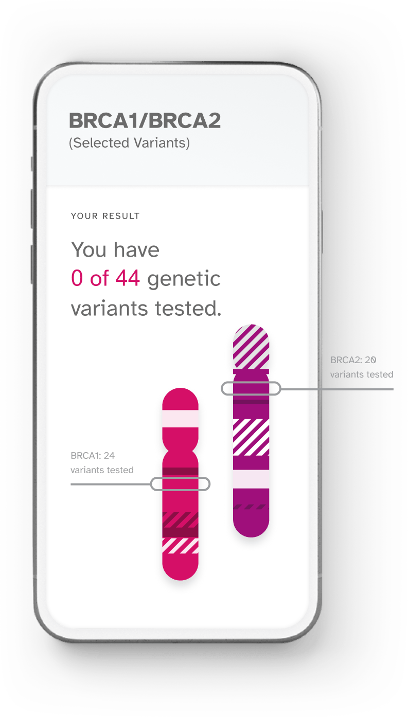 *The 23andMe PGS test includes health predisposition and carrier status reports. Health predisposition reports include both reports that meet FDA requirements for genetic health risks and reports which are based on 23andMe research and have not been reviewed by the FDA. The test uses qualitative genotyping to detect select clinically relevant variants in the genomic DNA of adults from saliva for the purpose of reporting and interpreting genetic health risks and reporting carrier status. It is not intended to diagnose any disease. Your ethnicity may affect the relevance of each report and how your genetic health risk results are interpreted. Each genetic health risk report describes if a person has variants associated with a higher risk of developing a disease, but does not describe a person’s overall risk of developing the disease. The test is not intended to tell you anything about your current state of health, or to be used to make medical decisions, including whether or not you should take a medication, how much of a medication you should take, or determine any treatment. Our carrier status reports can be used to determine carrier status, but cannot determine if you have two copies of any genetic variant. These carrier reports are not intended to tell you anything about your risk for developing a disease in the future, the health of your fetus, or your newborn child's risk of developing a particular disease later in life. For certain conditions, we provide a single report that includes information on both carrier status and genetic health risk. Warnings & Limitations: The 23andMe PGS Genetic Health Risk Report for BRCA1/BRCA2 (Selected Variants) is indicated for reporting of 44 variants in the BRCA1 and BRCA2 genes. The report describes if a person's genetic result is associated with an increased risk of developing breast cancer and ovarian cancer and may be associated with an increased risk for prostate cancer, pancreatic cancer, and potentially other cancers. The variants included in this report do not represent the majority of the BRCA1/BRCA2 variants in people of most ethnicities. This report does not include variants in other genes linked to hereditary cancers and the absence of variants included in this report does not rule out the presence of other genetic variants that may impact cancer risk. This report is for over-the-counter use by adults over the age of 18, and provides genetic information to inform discussions with a healthcare professional. The PGS test is not a substitute for visits to a healthcare professional for recommended screenings or appropriate follow-up. Results should be confirmed in a clinical setting before taking any medical action. For important information and limitations regarding each genetic health risk and carrier status report, visit 23andme.com/test-info/